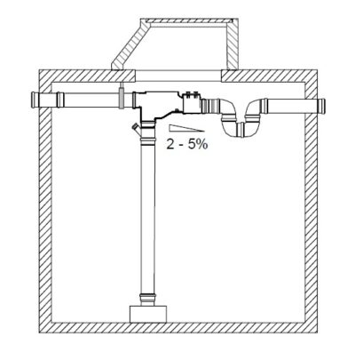Il est composé d’un raccord à la verticale pour la pose d’une arrivée calme et d’un trop plein équipé d’un clapet anti-retour évitant le retour dans la cuve des eaux évacuée et l’entré de rongeur.